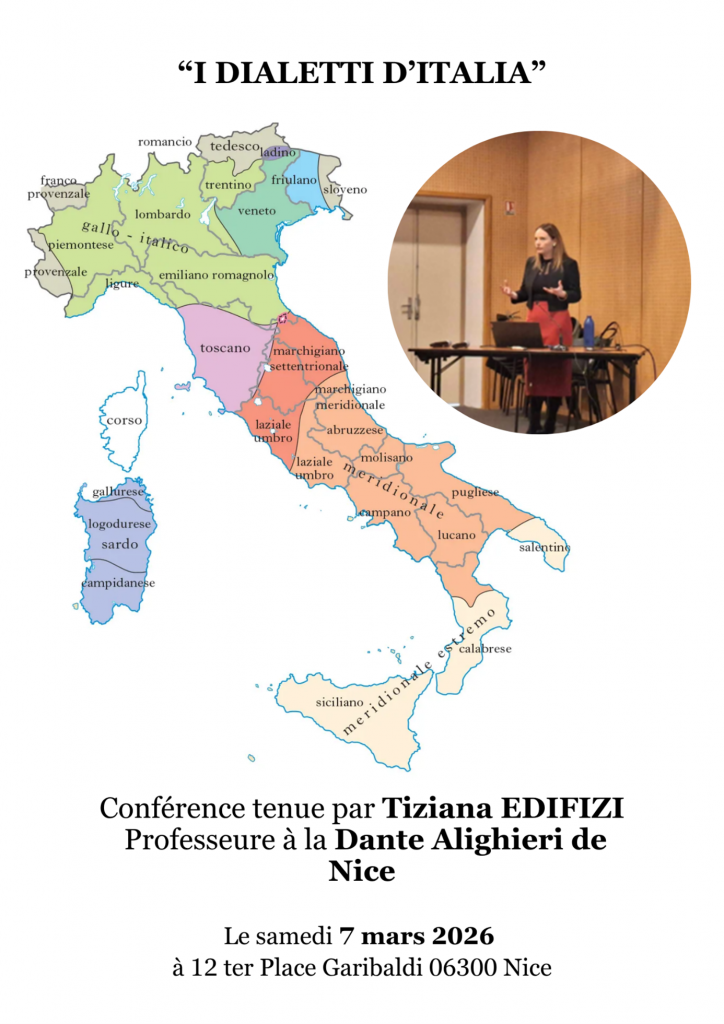 Conférence « I dialetti d’Italia » tenue par Tiziana Edifizi, professeure à la Dante Alighieri. Samedi 7 mars 2026. Espace Association place Garibaldi, Nice.